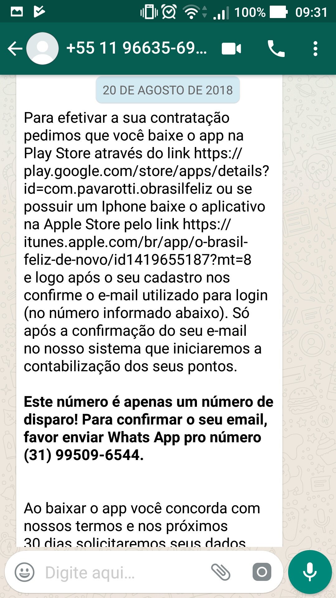 Um print mostra que aos ativistas eram prometidas remunerações de até R$ 2 000 por mês, e outro, que um número de WhatsApp com DDD 31 (Minas Gerais) estava envolvido na verificação dos perfis. Aqui o nome do aplicativo é “Brasil feliz de novo”, slogan da campanha de Lula.